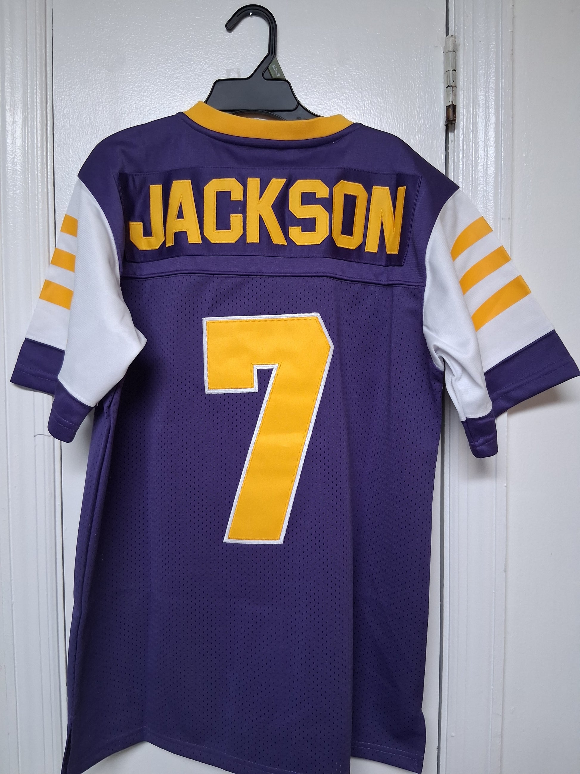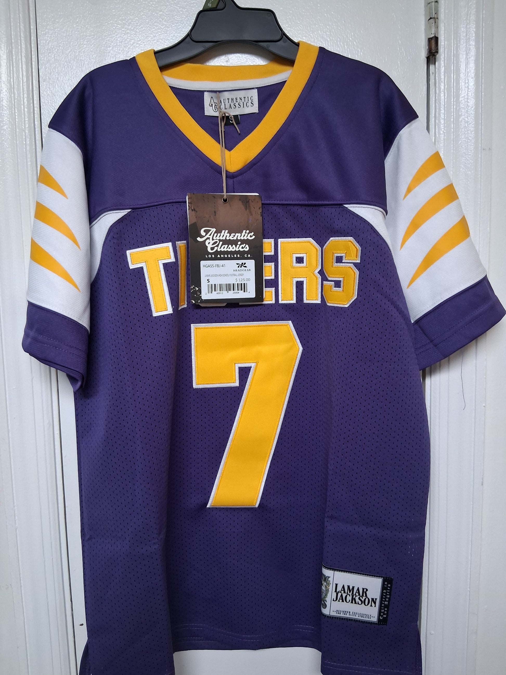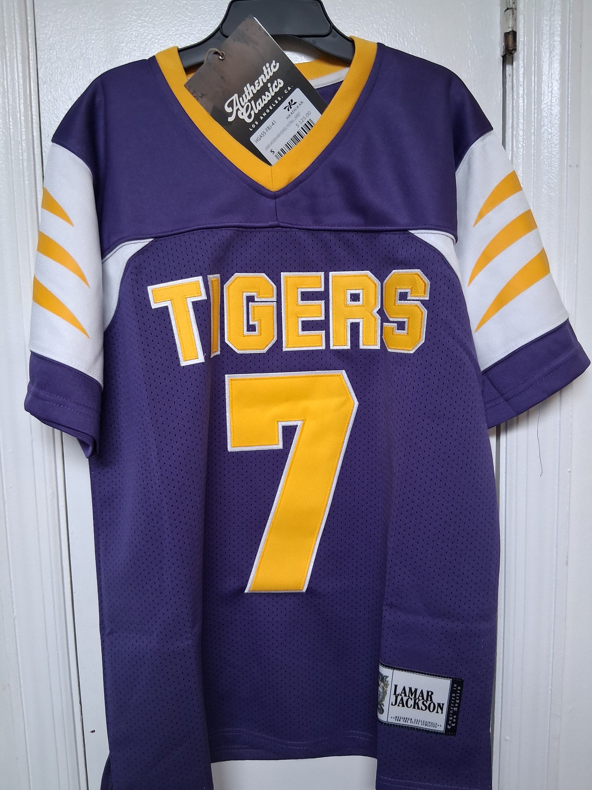 Show your support for a rising star with the Lamar Jackson high-school Jersey! This vibrant purple and gold #7 jersey captures the spirit of excellence and determination. Wear it proudly and feel inspired by the legacy of a true athlete! Perfect for fans who appreciate real talent.Lamar Jackson high-school Jersey. Go Tigers