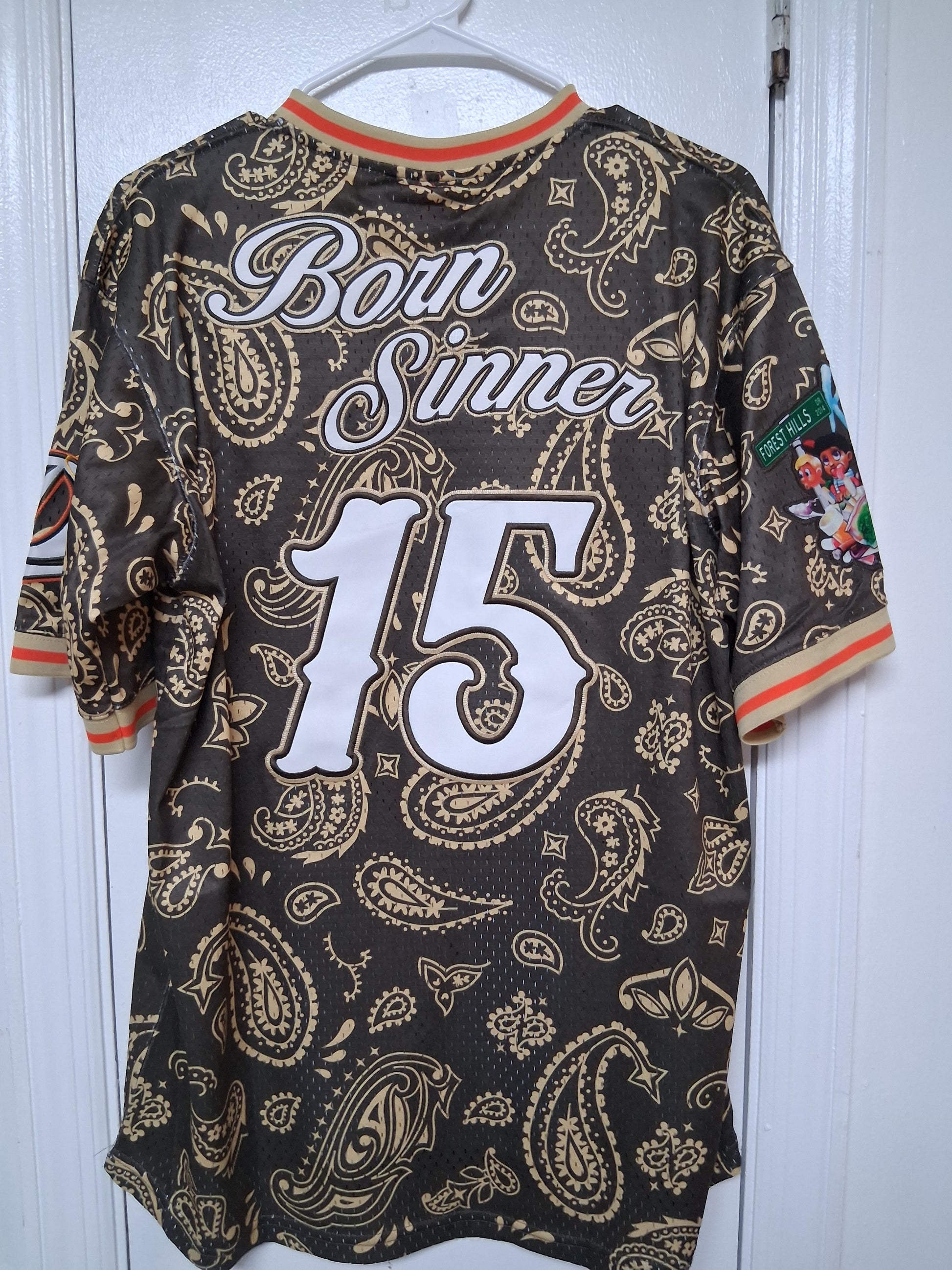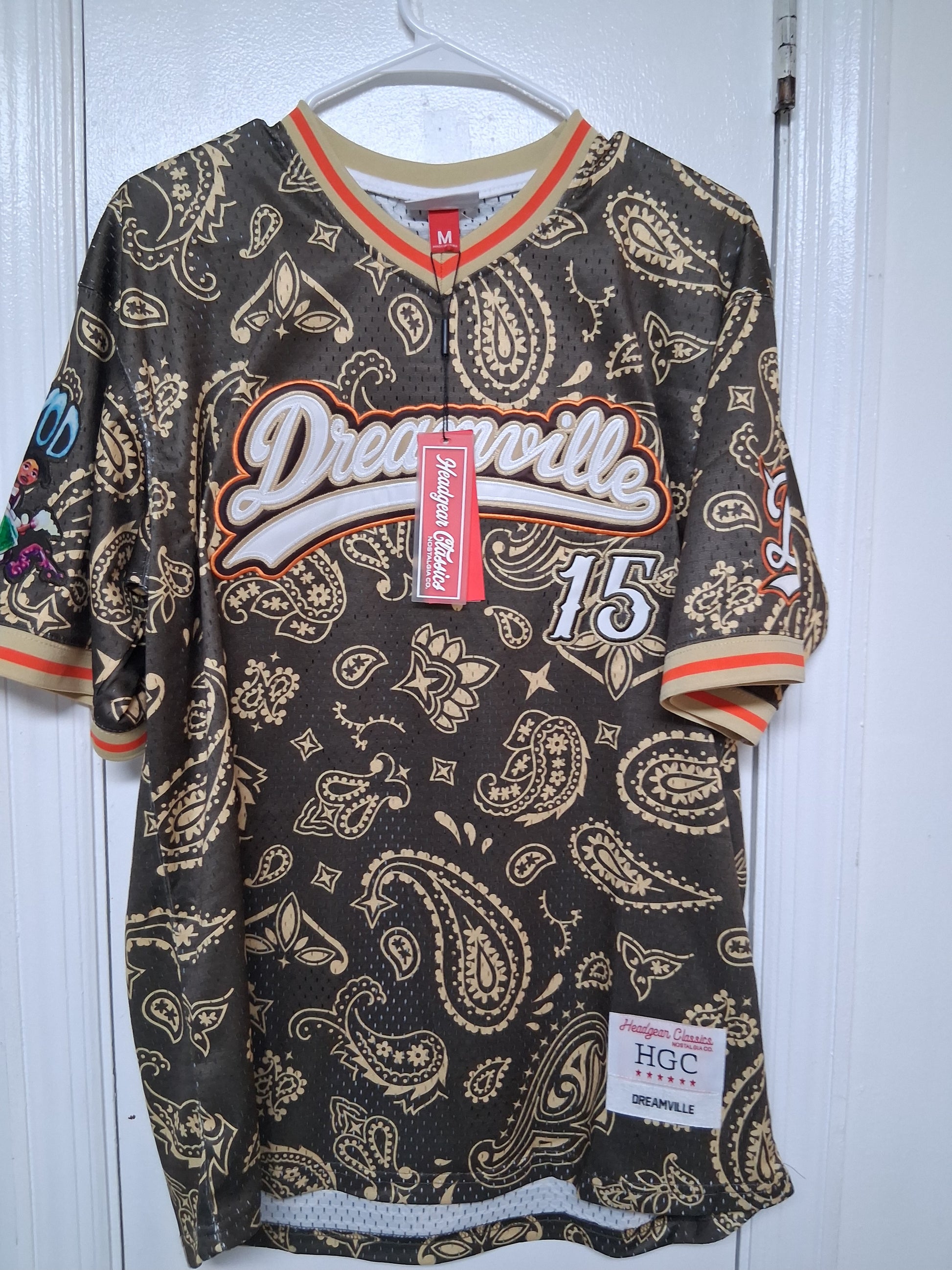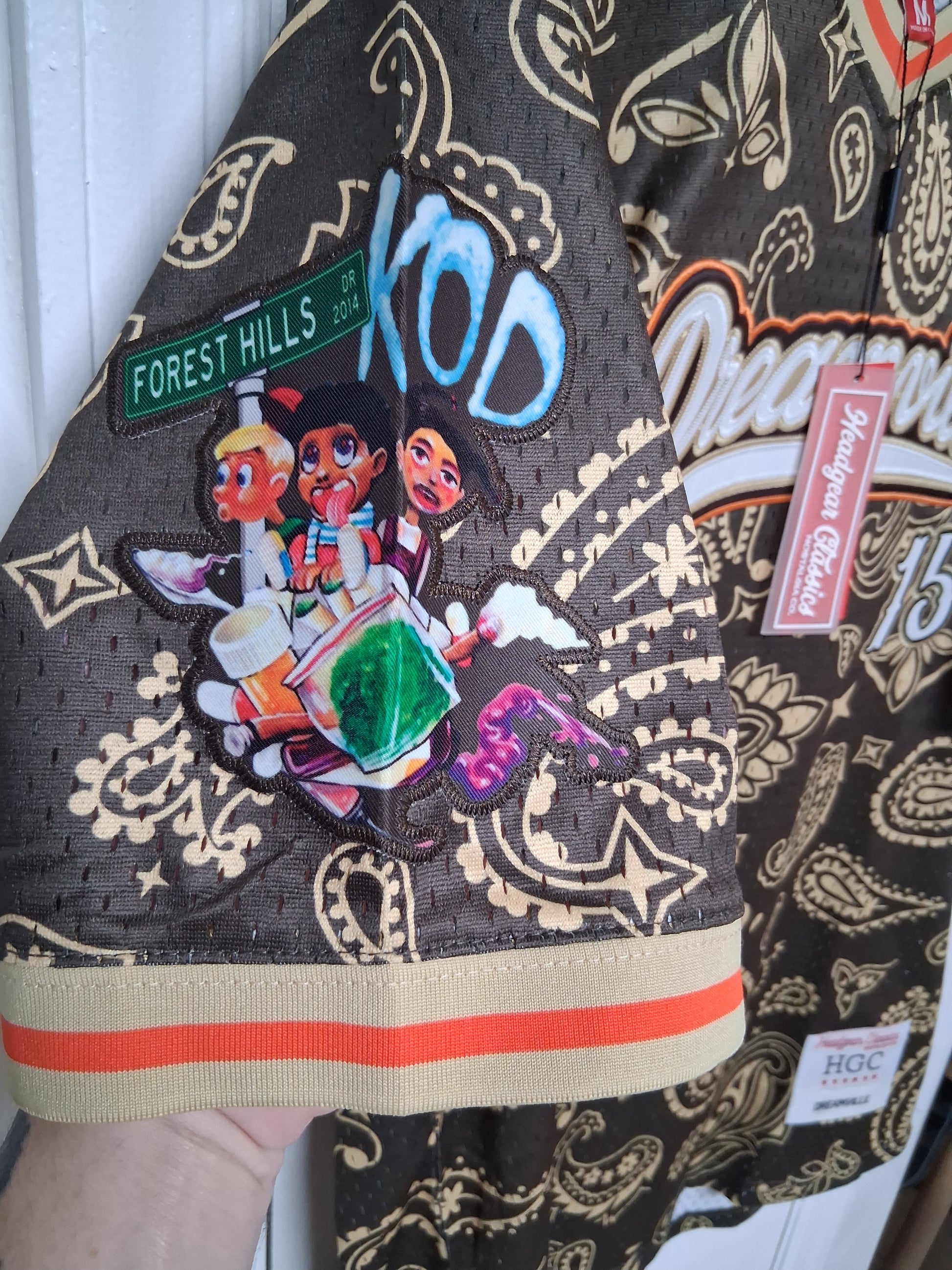 Unleash your bold spirit with the Dreamville jersey in striking brown and gold paisley! This eye-catching piece dares you to stand out and make a statement. Embrace the adventure of self-expression as you conquer any crowd. Wear it, own it, and let your style tell your story!Brown and gold paisley Dreamville Jersey . Kod design patch on the sleeve